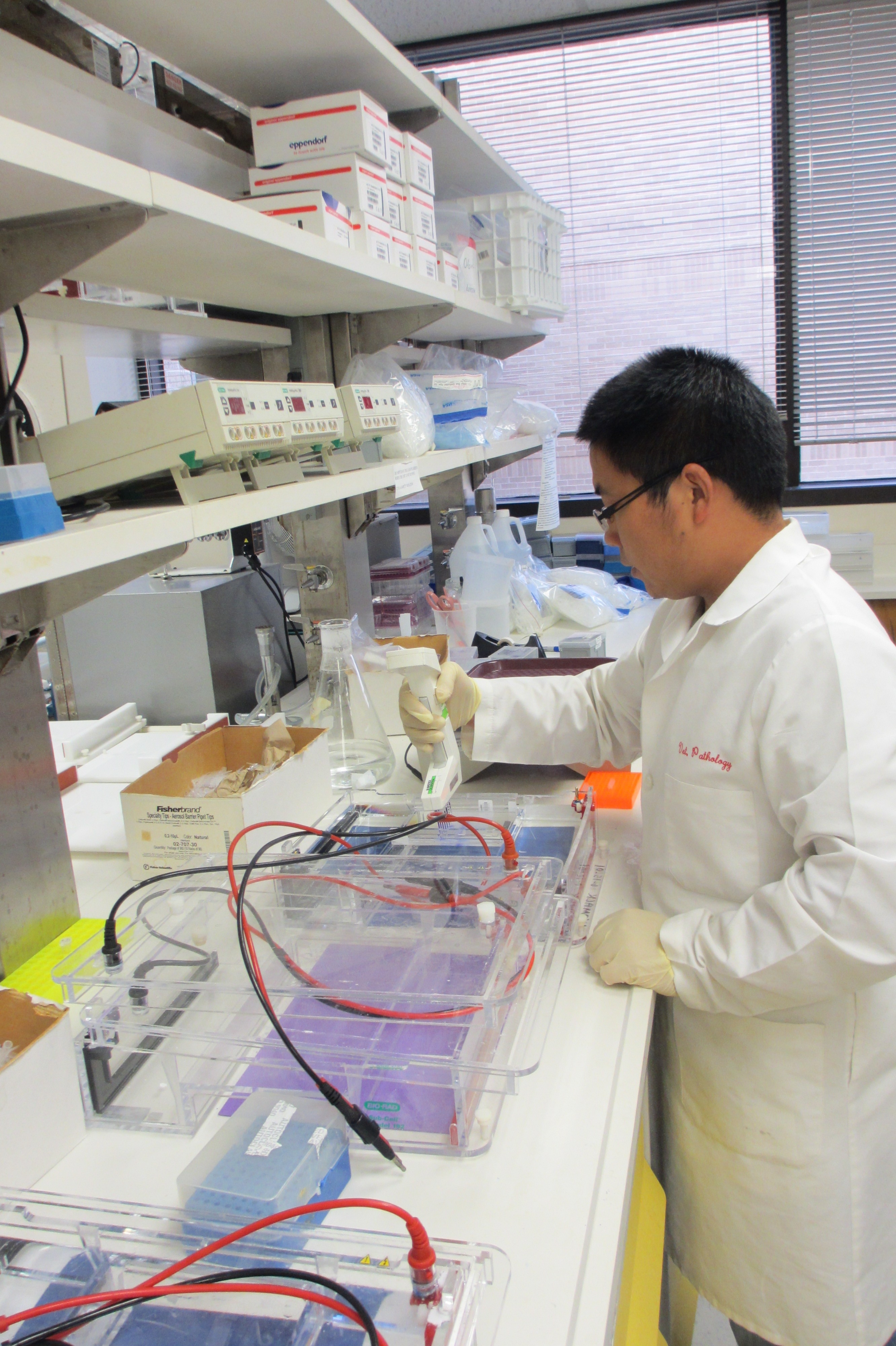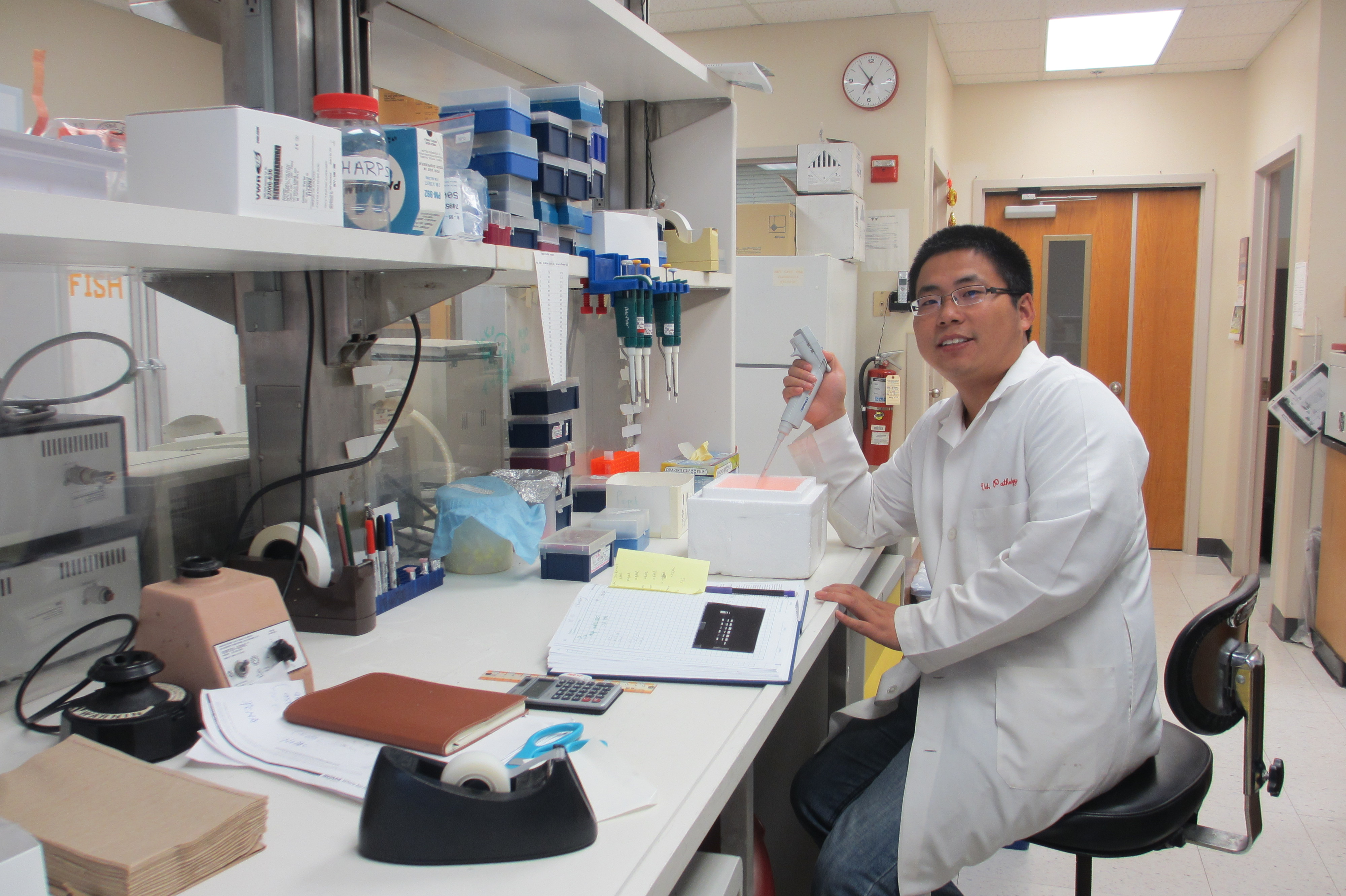 在到达美国的第2天,我就进了Dr. Womack的实验室。在他的介绍下,我认识了正在实验室工作的管理人员,博士后和博士生。按照他们实验室的要求,不论你是本科生还是研究生,初次进入实验室,特别是对于新来者,进入实验室之前都要经过实验室管理员的严格培训,培训内容主要包括实验室安全、化学及生物废品处理方法,出现事故后如何正确处理等等。培训合格后才可以进入实验室,管理员会给你安排一个固定的学习座位和试验台,你还可以从实验室管理员那里领取一个新的试验记录本,个人专用的试剂、加样器、一些常规的仪器和试验材料。实验室的设施先进齐全,一般几个教授的实验室都是相通的,试验中遇到需要的实验设备不在本实验室时,实验管理员会和老师协商后,会带你去登记使用,经过第一次的培训和使用,以后就都可以自己操作,随时使用,但是要每次都做好仪器使用记录。