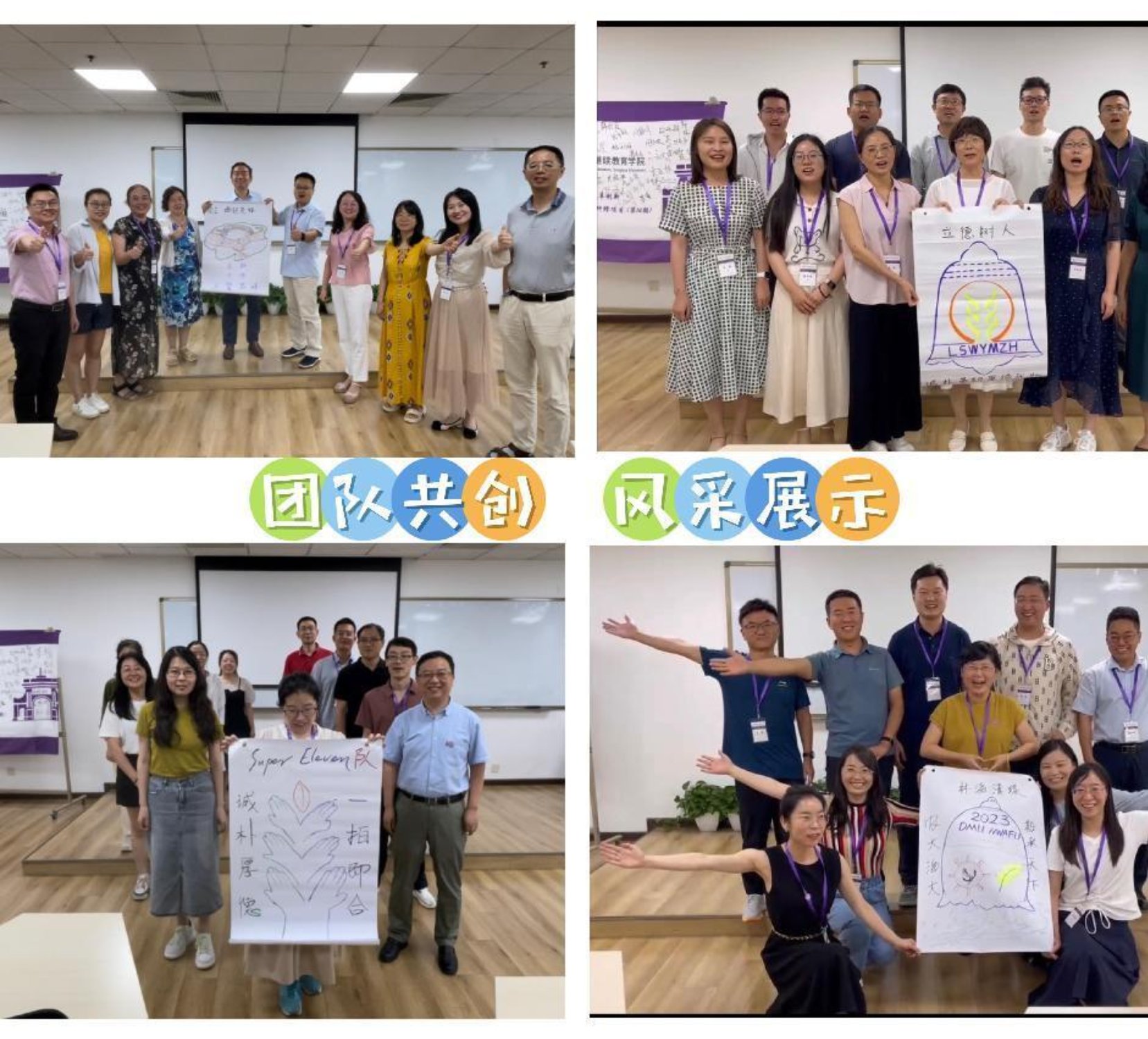 学习之余班主任精心组织举办团队共创活动,进行小组风采展示。四个小组分别展示自己的组名、组徽、口号及造型,导师们群策群力,放飞想象,尽情发挥,组建了“西部先锋队”、“Super Eleven队”、“立德树人队”、“林海清缘队”。通过团队共创,导师之间加深了了解,深厚了情谊。精彩的课程学习结束之后,进行学习成果汇报,每个小组派一位代表发言,畅谈学习体会。