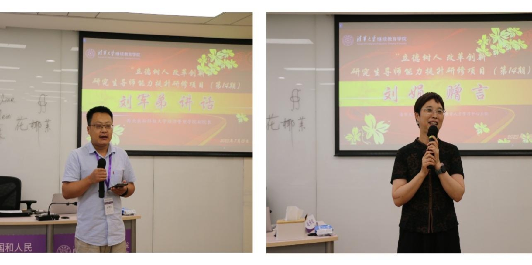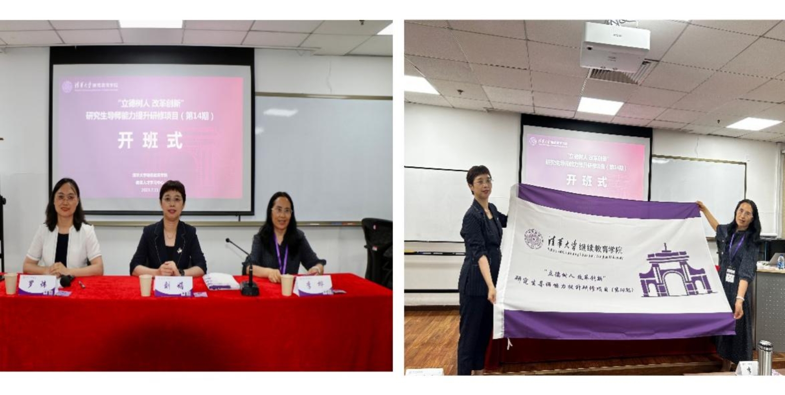 7月11日晚上,开班仪式在清华科技园创新大厦A座309教室举行。清华大学继续教育学院教育人才学习中心主任刘娟致辞,对大家的到来表示热烈欢迎,希望这次培训对大家来说是一次 “修心之旅、赏心之旅、匠心之旅”,希望各位导师浸润清华,感受清华,用心汲取清华的力量,学有所得、学有所悟、博采众长、蓄势待发!我院李桦教授代表学院全体学员,对清华大学继续教育学院及各位老师表示衷心感谢,对培训班学员提出具体要求和殷切希望。开班仪式由清华大学继续教育学院人才学习中心副主任罗炜主持。随后授班旗,奏校歌,戴校徽;班主任王潇莹老师作学习导读《遇见·清华》,学习班级公约,介绍“四维一体”培训模式(专家引领、团队学习、实践体验、文化熏陶)和教学活动安排,班委成员集体宣誓。